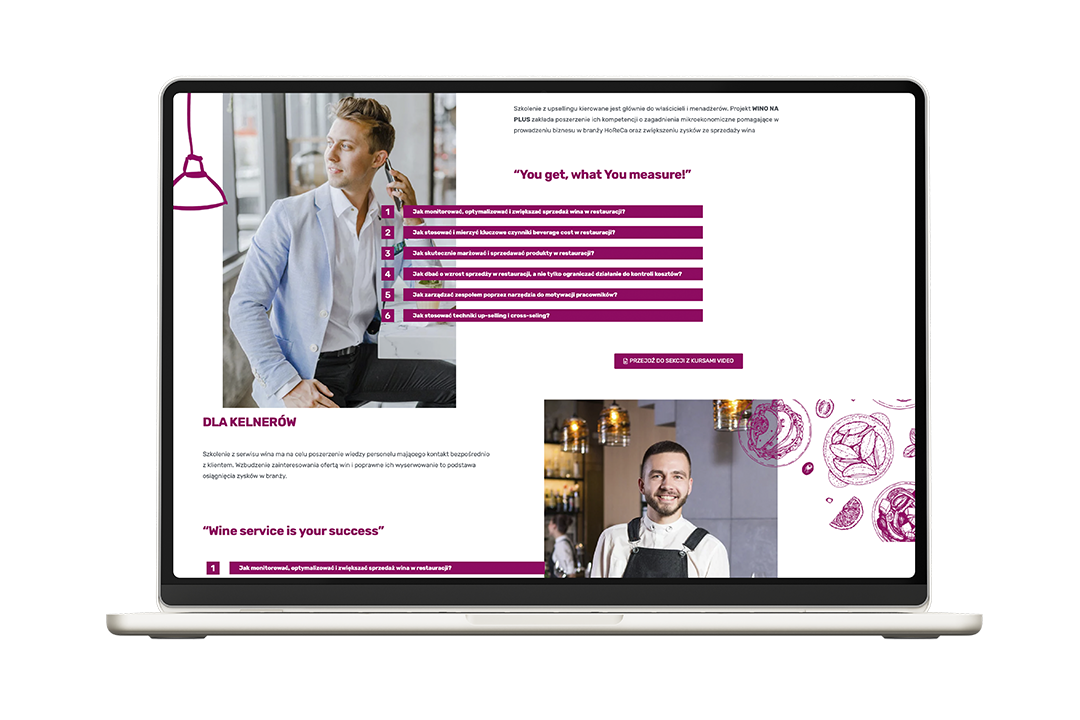 To specjalna platforma e-Learningowa rozwijająca kompetencje obsługi i kadry menadżerskiej w restauracji. Ponad 40 filmów z zakresu serwisu wina i edukacji sommelierskiej ułatwia onboarding nowego zespołu w restauracji i szkolenie obecnego personelu.